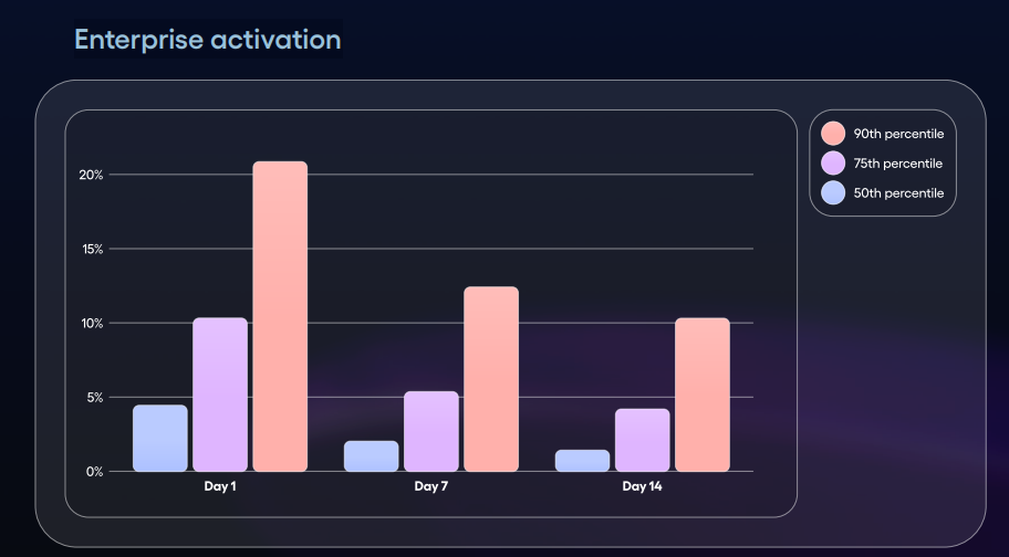 Au cap critique des sept jours, les entreprises du top 10 % affichent un taux d’activation de 12,4 %, soit près de six fois supérieur à la médiane (2,1 %). Cet écart a des implications majeures sur la fidélisation long terme, mais aussi sur la monétisation et la croissance organique.