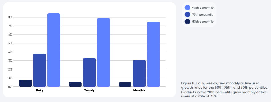 Les produits situés dans le 90e centile ont enregistré une croissance mensuelle de leurs utilisateurs actifs de 7,5 %.