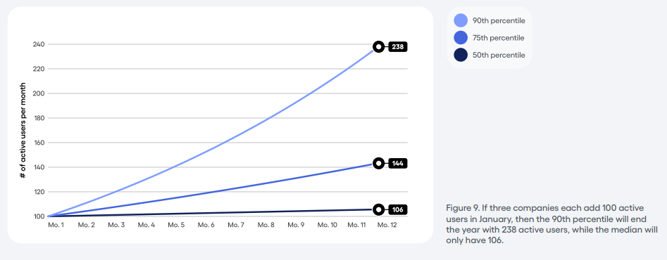 Figure 9. Si trois entreprises gagnent chacune 100 utilisateurs actifs en janvier, celle du 90e centile terminera l’année avec 238 utilisateurs actifs, tandis que l’entreprise médiane n’en comptera que 106.