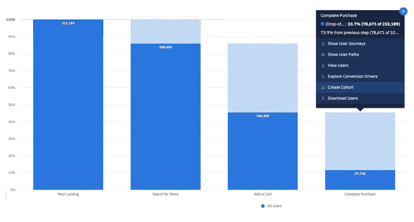 Prenons un exemple : l’analyse d’entonnoir (funnel analysis) ci-dessous illustre le parcours client, depuis l’arrivée sur la page d’accueil d’un site web jusqu’à la finalisation d’un achat sur une application e-commerce.